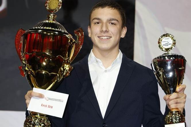 Levi Arn (Mitte) wurde nicht nur KZ2-Meister, er war auch Rookie des Jahres bei den Schaltkarts und stellte einen neuen Punkterekord auf © myrally.ch Insgesamt wurden für alle Kategorien 30'000 Franken Preisgeld ausgeschüttet. Begrüsst wurde die Schweizer Kart-Gemeinde von Paul Gutjahr, Mitglied der Geschäftsleitung von Auto Sport Schweiz. Für die Sportliche Auflockerung des Programms sorgte BMX-Profi Den Hennig, die Nummer 10 der Weltrangliste. Neben den zahlreichen Pokalen gab es bei der diesjährigen Meisterfeier auch eine Tombola. Der Preis, eine Reise zu einem DTM-Rennen für zwei Personen – gesponsert von GAST Reisen, ging ins Welschland an die Familie Rothen – herzliche Gratulation! Der Erlös aus dem Losverkauf wird dem Kinderspital Zürich respektive der Sepsis-Forschung gespendet. Ein Dankeschön geht auch die weiteren Sachpreis-Sponsoren: Update Fitness (Abos), Swiss Hutless und VEGA (Reifen) sowie Carrera (Slotcar-Rennbahnen). Ein besonderes «MERCI!» geht an den Hauptsponsor der Schweizer Kart-Meisterschaft: die autobau Erlebniswelt in Romanshorn von Fredy und Alexander Lienhard ist seit 14 Jahren treuer Partner der Schweizer