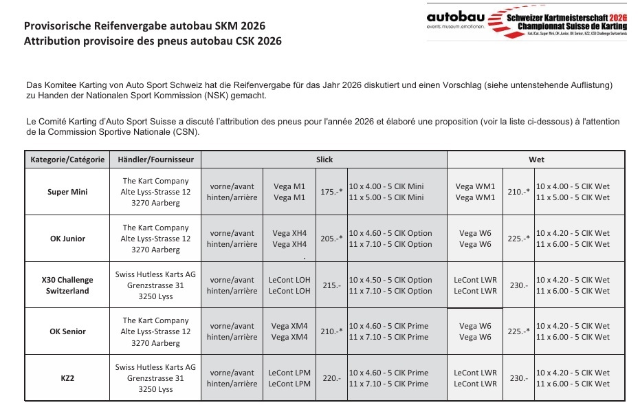 SKM 2026»: Prov. Reifenvergabe Das Komitee Karting von Auto Sport Schweiz hat die Reifenvergabe für das Jahr 2026 diskutiert und einen Vorschlag zu Handen der Nationalen