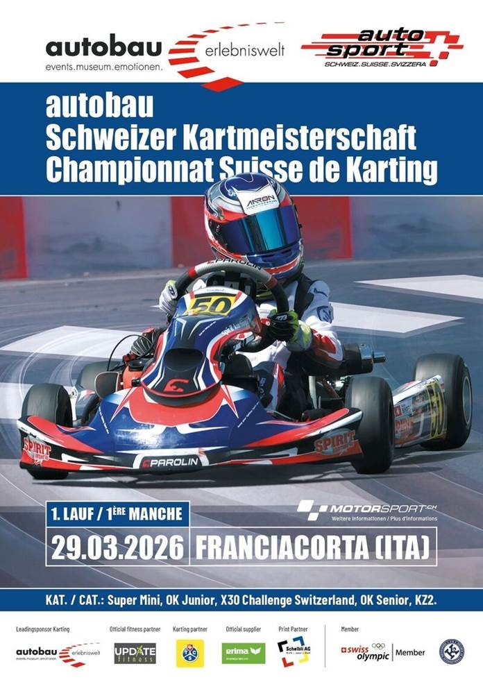 ![]() Melde dich jetzt für das erste SM-Rennen 2026 an!!! Am 29. März beginnt die Saison 2026 der autobau Schweizer Kart-Meisterschaft. Das erste Rennen steigt in Franciacorta (ITA). Wer dabei sein will, kann sich ab sofort einschreiben! Auf die Plätze, fertig, los! Am 29. März beginnt im italienischen Franciacorta die neue Saison der autobau Schweizer Kart-Meisterschaft. Für den ersten Lauf ist die Einschreibung unter diesem Link ab sofort offen. Dasselbe gilt für Fahrer und Fahrerinnen, die sich für die komplette Saison einschreiben wollen. Wer sich für alle sechs Rennen vor Saisonbeginn einschreibt, fährt ein Rennen gratis und wer sich dazu noch für den autobau Visierkleber entscheidet, erhält ein zweites Startgeld nach der Saison rückvergütet! Wie im Vorjahr werden in der autobau Schweizer Kart-Meisterschaft fünf Kategorien am Start stehen: Super Mini, OK Junior, X30 Challenge Switzerland, OK Senior und KZ2 (inkl. KZ2 Masters). Im Gegensatz zu 2025, als die Meisterschaft aus fünf Rennen bestand, werden in der Saison 2026 sechs Rennen ausgetragen. Hier nochmals die Termine im Überblick: 29. März,