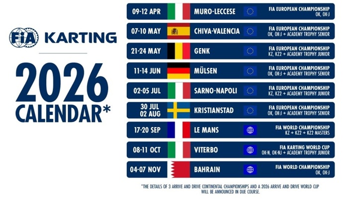 LO Schweizer Kart Meisterschaft 2026 1. Lauf 29. März Franciacorta (ITA) 2. Lauf 19. April 7 Laghi (ITA) 3. Lauf 31. Mai Levier (FRA) 4. Lauf 12. Juli Lonato (ITA)5. Lauf 23. August Cremona (ITA) 6. Lauf 10. Oktober Wohlen (CH)